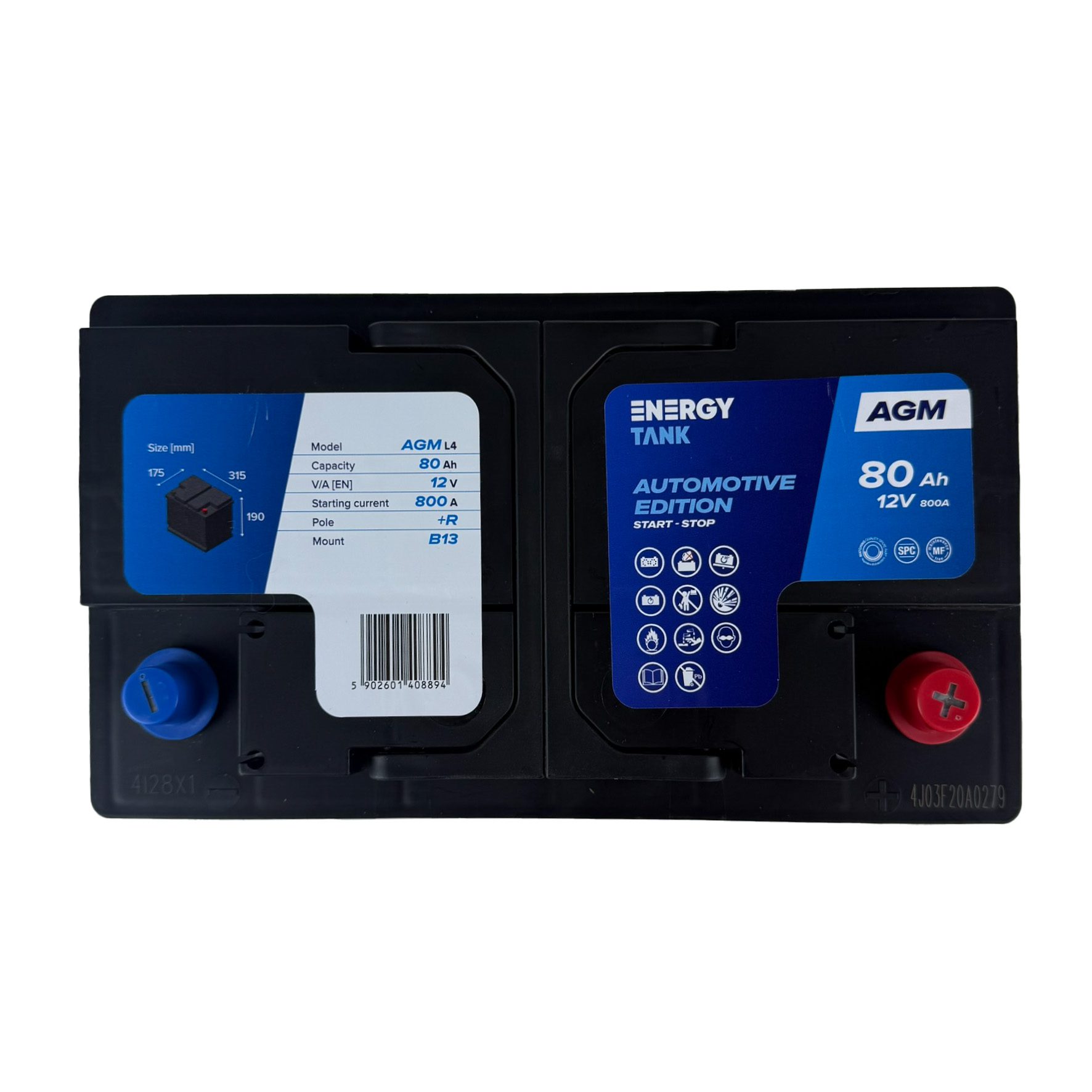 Akumulator EnergyTank AGM 80Ah to bezobsługowy akumulator rozruchowy w technologii AGM, wyróżniający się dużą pojemnością, odpornością na wibracje i długą żywotnością. Przeznaczony do SUV-ów, samochodów osobowych wyższej klasy i pojazdów z systemem Start-Stop.